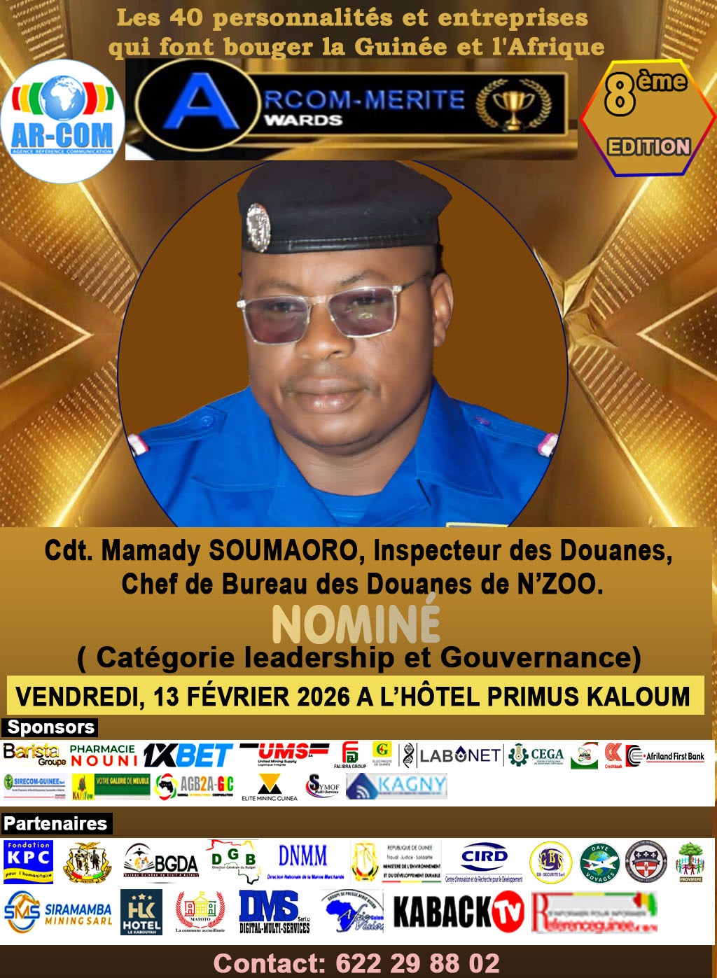 Parmi les figures retenues pour cette édition figure le Commandant Mamady SOUMAORO, Inspecteur des Douanes et Chef de Bureau des Douanes de N’ZOO, nominé dans la catégorie Leadership et Gouvernance. Cette distinction vient saluer un parcours professionnel marqué par la rigueur, la discipline et un sens élevé de la responsabilité publique.